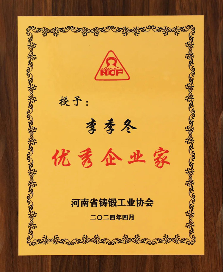 在河南省鑄鍛工業(yè)年會(huì)上,公司領(lǐng)導(dǎo)李總被授予“優(yōu) 秀企業(yè)家”稱號(hào)。